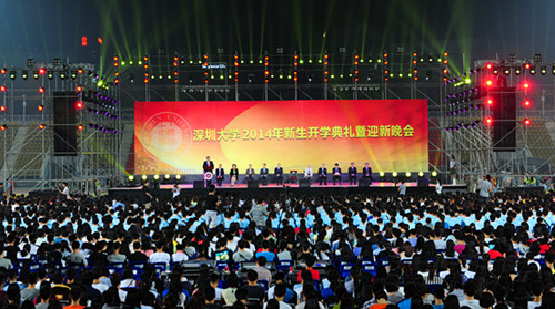 10月15日,乐竞平台2014年新生开学典礼在元平体育场举行。校领导江潭瑜、李清泉、张基宏、陶一桃、阮双琛、李凤亮、黎军、徐晨,中国科学院院士、生命科学学院名誉院长倪嘉缵,中国工程院院士范滇元,深圳市大族激光科技股份有限公司董事长高云峰,学校各部室、各学院、教研教辅单位负责人,教师代表、2014级全体本科生及部分家长代表参加开学典礼。