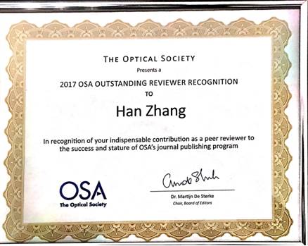 我校范滇元院士团队张晗教授获“美国光学学会(OSA)杰出审稿人奖”