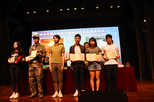 赖群阳宣读深圳市第三届征兵海报设计大赛表彰通报。会上表彰了一等奖1名,二等奖3名,三等奖5名,优秀奖15名,网络人气奖7名。其中,我校汤培伟同学荣获一等奖,杨子慧同学荣获二等奖。