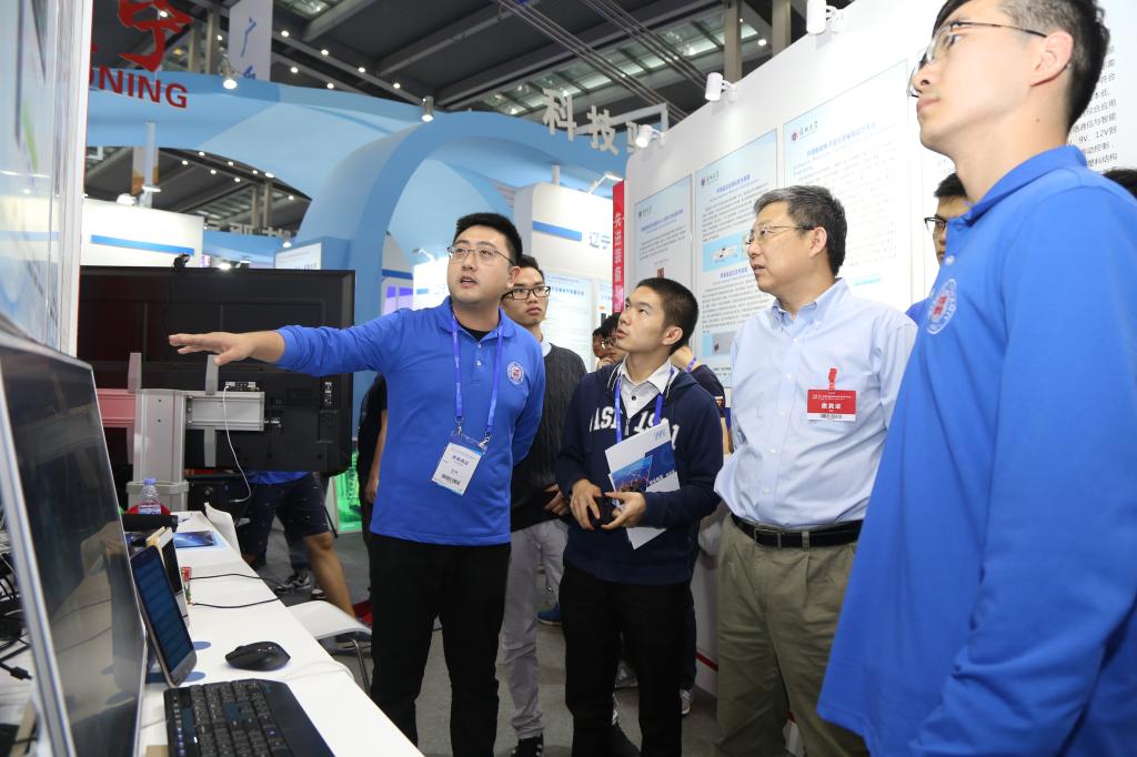 李清泉沿着通道逐一观摩我校参展的项目成果,聆听项目负责人介绍产品,仔细询问了项目的创新点、应用性与市场前景,并和参展师生亲切交流。他对改善代谢功能障碍中老年人的特供饮品、人工智能筋膜理疗椅、母婴康、智能维检空中机器人、类石墨烯包覆氧化亚铜海洋防污材料等成果的创新性给予了充分肯定。