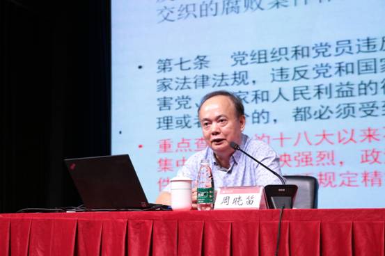 周晓笛结合自身工作经历和大量的详实案例,围绕《中国共产党纪律处分条例》中有关廉洁规定的理解与适用;高校党政干部违纪违法案的警示;“围猎”党员干部的十大套路三个要点出发,做了一场别开生面的讲座。
