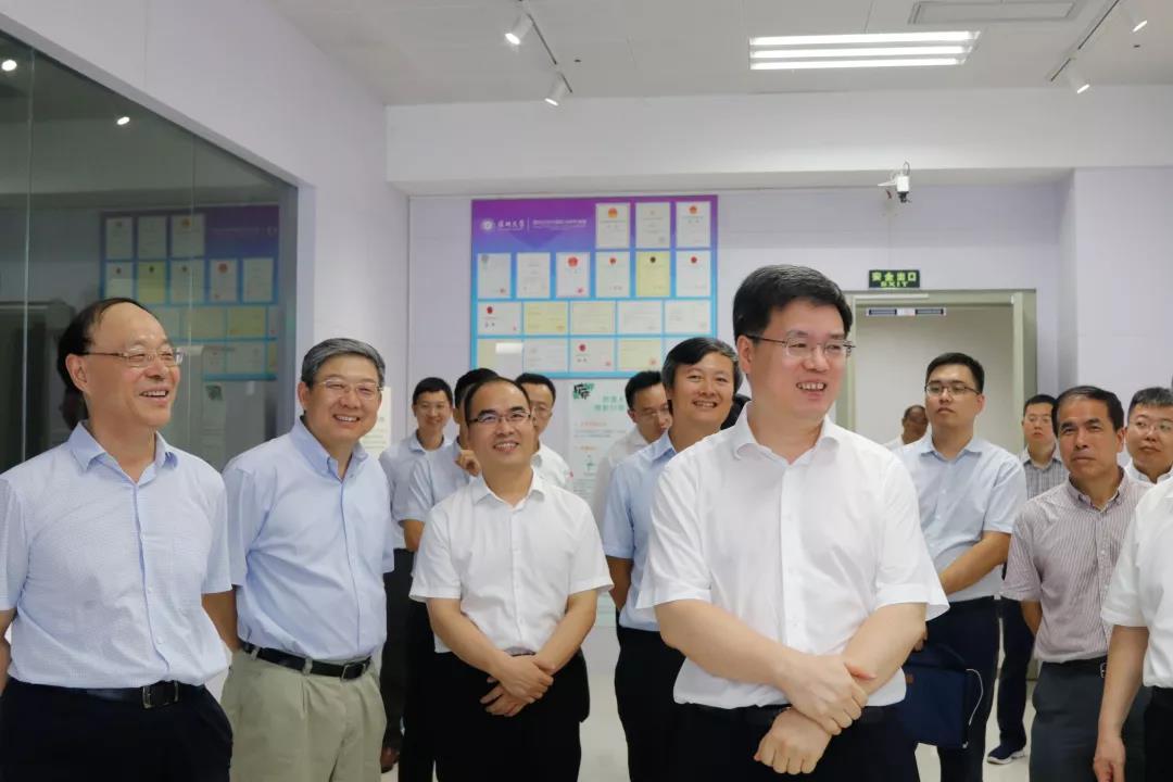 随后,覃伟中一行来到我校计算机与软件学院参观了大数据系统计算技术国家工程实验室。在国家工程实验室展示厅,学院相关负责人详细介绍了计算机与软件学院的师资力量、学术骨干、12个国家和省部级科研平台以及发表的高水平论文、授权发明专利、PCT专利、国家自然科学基金项目、国际合作项目等。覃伟中对我校取得的学术成果和发展建设情况表示赞赏。