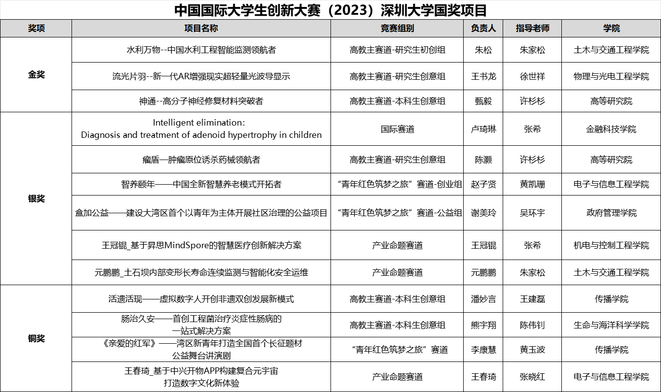 自本届大赛启动以来,乐竞平台累计8596个项目(高教赛道6899个,红旅赛道1474个,产业赛道223个)报名参赛,参赛学生超3万人次,创历史新高;经过多轮选拔比拼,学校代表队共有39支队伍成功晋级广东省决赛,共获得26金13银,金奖比例高达66.7%,刷新了广东省高校参赛有史以来金奖数量的最高记录;经过激烈的国赛网评,学校共有8支队伍晋级国赛决赛,最终获得3金5银的优异成绩,创造深大历史最佳纪录;另外,还推荐1支队伍参加国际赛道,荣获银奖。