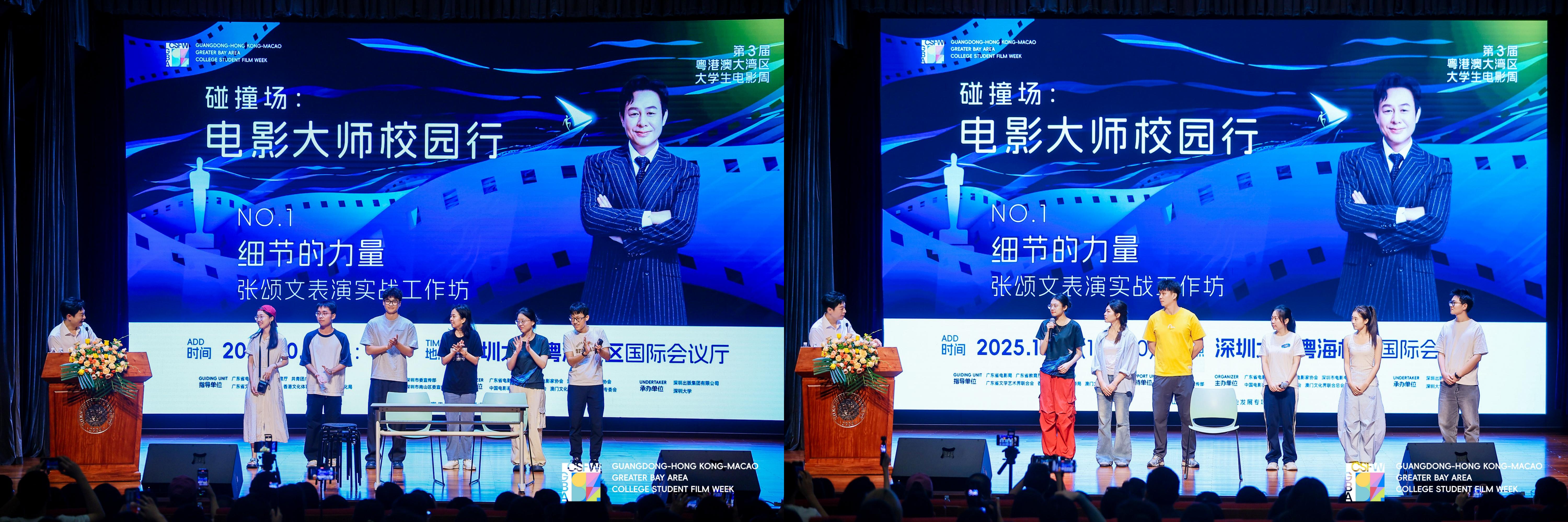10月19日,第3届粤港澳大湾区大学生电影周“碰撞场:电影大师校园行”首场活动在乐竞平台粤海校区国际会议厅举行。演员张颂文以“细节的力量:张颂文表演实战工作坊”为主题,开展沉浸式艺术分享与表演实战指导,通过生活化案例与即兴练习,为高校学子拆解 “艺术源于生活” 的创作真谛,现场掌声不断。