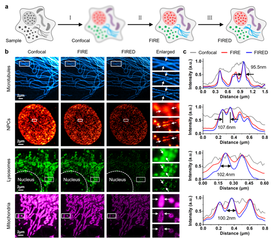 实验结果表明,FIRED技术能将普通共聚焦显微镜的横向分辨率提升约4倍(例如,荧光微球样品中从298.0 nm提升至71.2 nm),图像信背比(SBR)也显著提高。该技术兼容普通荧光染料,所需激光功率密度极低(~1.72 kW/cm2,比STED低3-4个数量级),光毒性小,并保留了共聚焦的光学层切能力。FIRED技术在固定细胞和活细胞的多种细胞器(微管、核孔复合体、溶酶体、线粒体)中均得到验证,展现出优异的通用性(图2)。该技术操作简便、硬件改动小、成本低、光损伤小的特点,为生物医学和材料科学领域,特别是活细胞长时程、多结构的超分辨动态研究,提供了一个经济高效且易普及的技术平台。