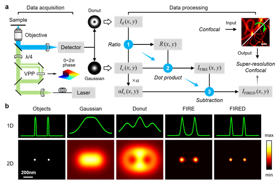 远场光学显微镜是揭示生物分子结构与动态的重要工具,但受限于光学衍射极限。该研究创新性地提出了荧光强度比率编码与差分(FIRED)超分辨成像技术。该方法基于传统共聚焦系统,仅需简单升级增加环形光路,利用相同波长的高斯光束与环形光束分别激发样本,获取两幅图像。通过对图像像素强度进行特定比率运算生成权重矩阵,并应用于原始图像进行编码,再结合差分处理,有效突破衍射极限(图1)。