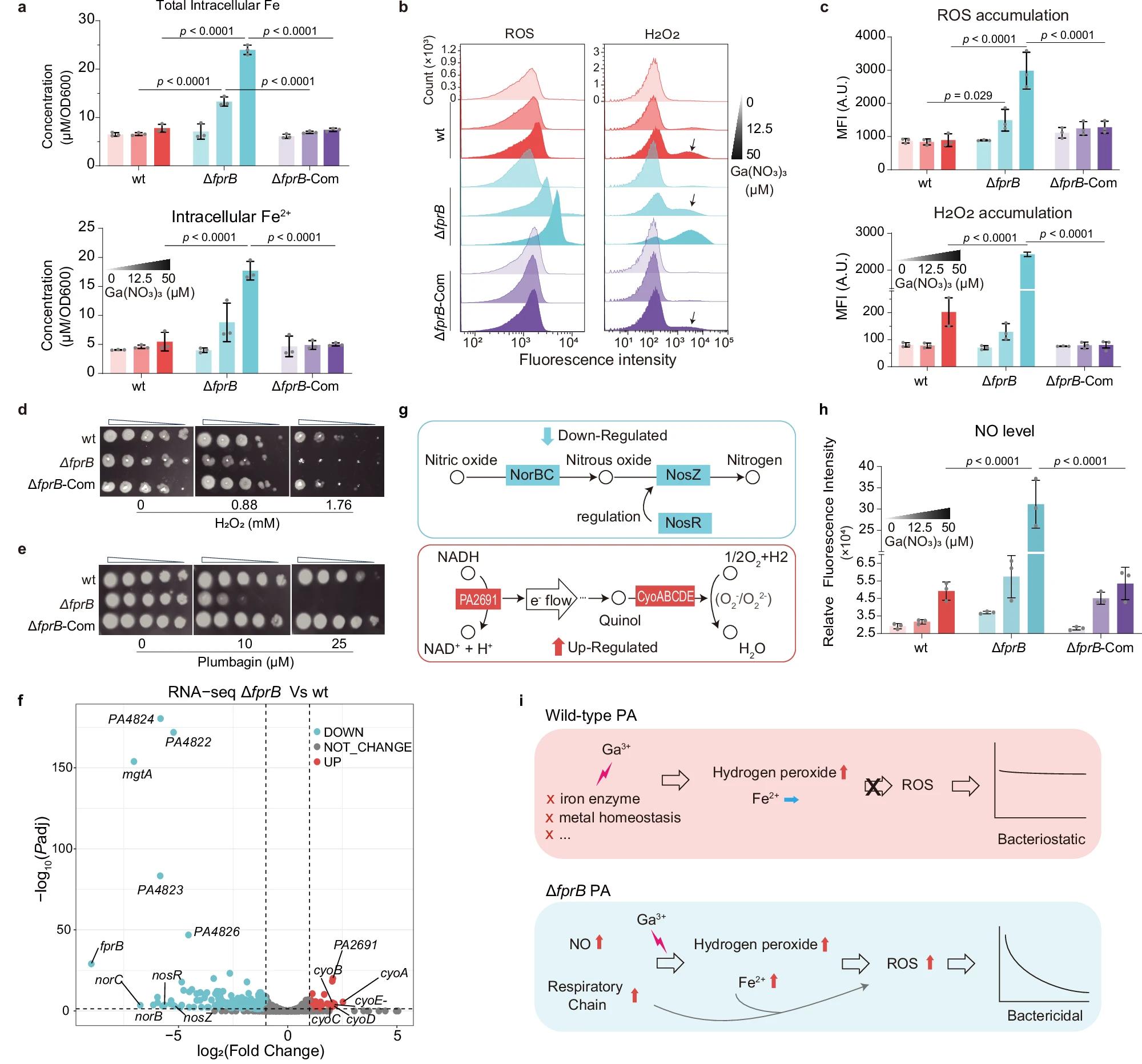 针对镓在临床治疗铜绿假单胞菌感染中存在的浓度限制问题,研究团队创新性地采用全基因组CRISPRi-seq技术,系统性筛选镓的协同增效靶点。经研究发现,高度保守的铁氧还蛋白-NADP+还原酶FprB,其缺失能将镓的最低抑菌浓度降低32倍以上,并使镓的抗菌模式从抑菌转变为杀菌。机制研究进一步揭示,FprB通过调控铁稳态和氧化还原平衡来抵抗镓引起的具有杀菌活性的氧自由基的积累。同时动物实验证实,缺失fprB能显著增强镓对生物被膜的抑制作用和提高肺部感染模型中的治疗效果。这一发现不仅为解决镓治疗浓度限制提供了新思路,也为抗耐药菌感染提供了有效的联合治疗策略,同时展示了CRISPRi-seq作为发现新型抗菌靶点的强大工具价值。