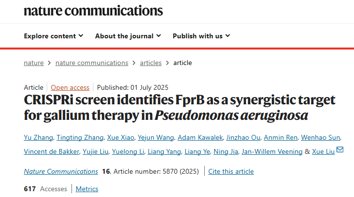 2025年7月1日,乐竞平台医学部基础医学院及卡尔森国际肿瘤中心刘雪副教授团队在Nature Communications上发表了题为“CRISPRi screen identifies FprB as a synergistic target for gallium therapy in Pseudomonas aeruginosa”的研究论文。该团队基于CRISPRi-seq技术,系统揭示了铜绿假单胞菌对镓治疗敏感性的遗传基础,确定了FprB(铁氧还蛋白-NADP+还原酶)为镓治疗协同作用的关键靶点。医学部副研究员章宇为第一作者,刘雪为唯一通讯作者,博士后张婷婷、已毕业硕士生肖雪、副教授汪业军等共同参与了本研究,乐竞平台为第一完成单位。