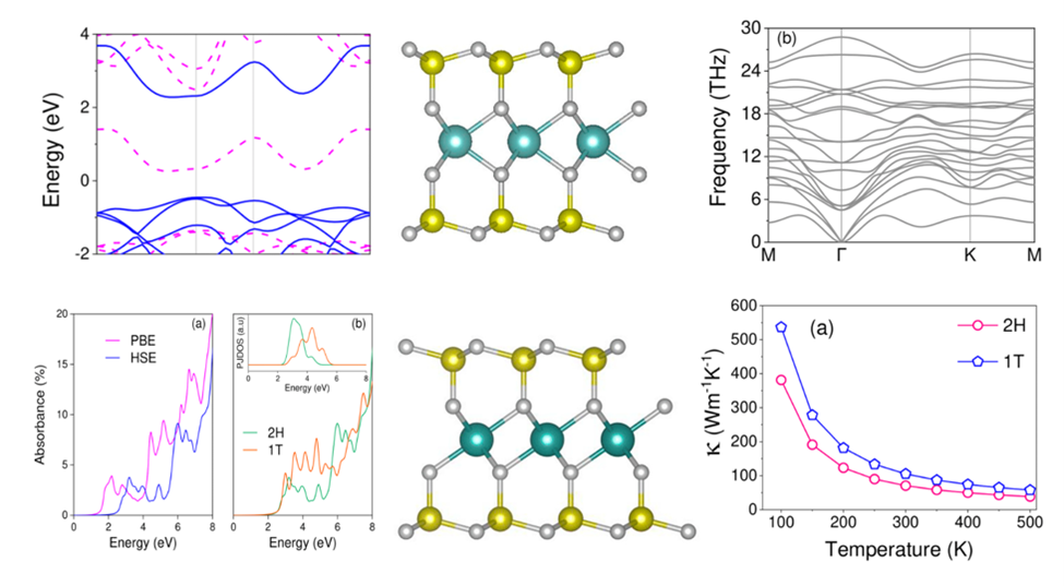 研究团队利用密度泛函理论系统比较了 ZrSi₂N₄ 在三方柱配位(2H 相)与八面体配位(1T 相)下的物性表现。结果发现,1T 相的带隙更小(约 2.23 eV),载流子有效质量显著降低,表明其具有更优越的载流子迁移率;同时,光吸收谱在 3–5.5 eV 区间出现更强吸收峰,展现了可调控的光学性质。在力学和热学方面,1T 相的杨氏模量更高、介电常数更低,并表现出 室温下约 105 W m⁻¹K⁻¹ 的高热导率,明显优于 2H 相。这一特性源自更长的声子寿命和更快的声子群速度,显示出其在高效散热与热管理技术中的应用潜力。