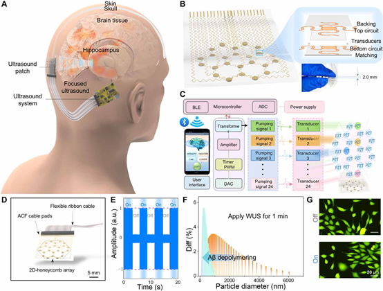 由于人口老龄化加剧,阿尔茨海默病(AD)的患病率持续上升。该病以Aβ斑块、Tau蛋白缠结和神经炎症为主要特征,当前治疗策略主要聚焦于抑制Aβ聚集及促进其解聚。超声波作为一种安全无创的技术,近年来被证实可有效促进淀粉样斑块解聚,显示出治疗AD的巨大潜力。然而,传统超声设备存在体积大、聚焦难、成本高和操作复杂等问题,严重限制了其临床推广与应用。为此,研究团队开发出一款便携、集成化且可调控的可穿戴超声系统,该系统由柔性超声阵列贴片、柔性电路及终端控制系统组成。实验结果表明,该装置不仅能显著减少AD模型小鼠脑内的淀粉样蛋白沉积,改善其认知功能,还可增强小胶质细胞对Aβ蛋白及碎片的吞噬作用,并促进其由促炎M1型向抗炎M2型极化,从而缓解脑内炎症反应。这一创新系统为AD的便携化、非侵入性治疗提供了新途径,也为神经退行性疾病的干预策略带来了重要突破。