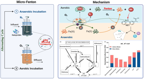 该研究构建一种受自然启发的微生物群落驱动的自维持MFenton系统,在近中性环境下实现药物类新污染物的高效降解(>80%)。该MFenton系统通过厌氧-好氧交替循环,促使异化铁还原菌群(关键菌属包括Sporanaerobacter、Sedimentibacter、Clostridium、Petrimonas和Actinomyces等),自主完成“Fe3+ 还原为 Fe2+”(厌氧阶段)和 “H2O2生成”(好氧阶段),进而原位持续产生HO˙。与传统芬顿工艺相比,本系统通过关键菌群的协同作用实现铁氧化还原循环的自维持,无需调节pH、能耗降低75%以上,且无外源化学试剂投加,具备良好的环境适应性与可持续性。本研究成果重新界定了微生物驱动高级氧化技术的应用边界,为解析自然铁氧化还原网络被工程化改造以实现动态环境中污染物去除提供了机制层面的见解。