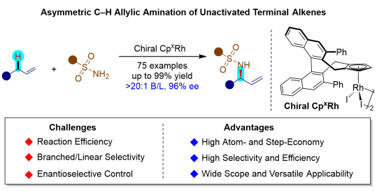 手性烯丙胺是一类在药物、天然产物及农药中广泛存在的核心活性结构,具有重要的生物和合成价值。传统的制备方法往往依赖复杂的预官能化底物或贵金属催化反应,效率较低且原子经济性不佳。相比之下,若能直接利用廉价且结构多样的非活化末端烯烃进行不对称C–H键胺化,将大大简化合成路线。然而,由于反应活性低、选择性控制困难,该策略长期被认为是有机合成领域的技术难题。针对这一科学问题,团队提出了创新性研究思路:以原位生成的高价碘亚胺化合物为氮宾前体,在手性环戊二烯基铑(III)催化剂作用下,通过金属–烯烃配位与烯丙位C–H活化形成π-烯丙基–Rh中间体,并实现立体选择性的C–N键偶联,从而在非活化末端烯烃上高效引入磺酰胺基团。研究团队最终建立了手性环戊二烯基铑CpxRh(III)催化体系,实现了非活化末端烯烃与磺酰胺之间的高对映选择性分子间烯丙位C–H胺化反应。该方法具有反应条件温和、底物范围广、支链与对映选择性优异、原子经济性高等突出优势,并可广泛应用于复杂生物活性分子的后期修饰和多种含氮骨架的构建。本项研究不仅为手性烯丙胺的高效合成提供了全新平台,也展示了C–H键直接官能化策略在有机合成与药物化学中的广阔应用前景。
