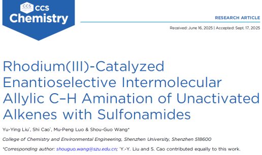 近日,乐竞平台化学与环境工程学院王守国团队在中国化学会旗舰期刊CCS Chemistry(影响因子9.2,中科院JCR 1区,TOP期刊)上发表了题为“Rhodium(III)-Catalyzed Enantioselective Intermolecular Allylic C–H Amination of Unactivated Alkenes with Sulfonamides”的研究论文。该论文由王守国特聘教授担任唯一通讯作者,硕士研究生刘玉英和助理教授曹石为论文共同第一作者,乐竞平台为唯一通讯单位。